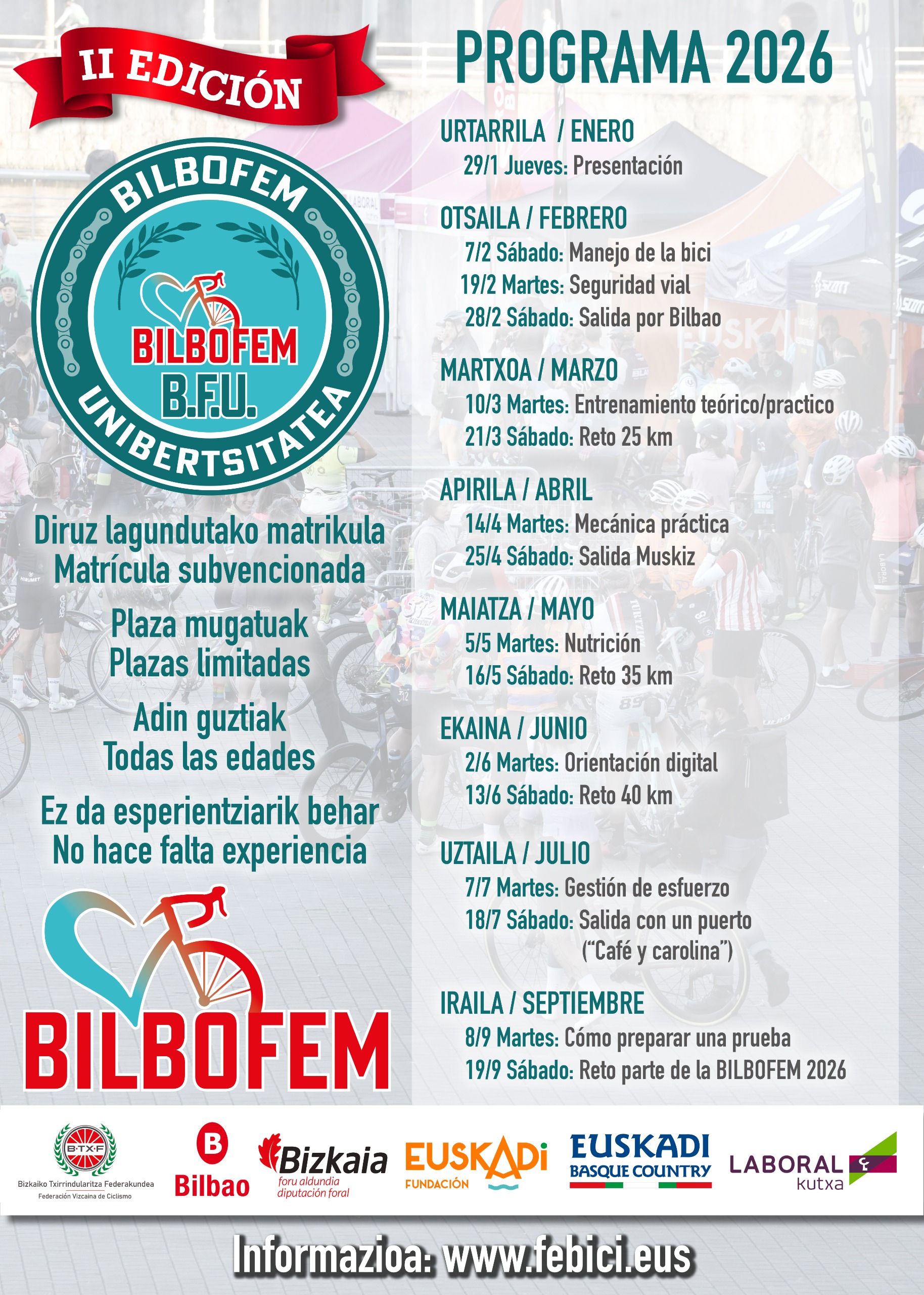 La «Comisión de las mujeres FEBICI» organiza la segunda edición del exitoso curso para iniciar a deportistas en el ciclismo de carretera (40 mujeres se iniciaron en 2025). Con el objetivo puesto en ayudar a que acaben participando en la marcha BILBOFEM (11 de octubre de 2026), se van a realizar dos acciones al mes (taller y salida en bici) desde enero a septiembre.